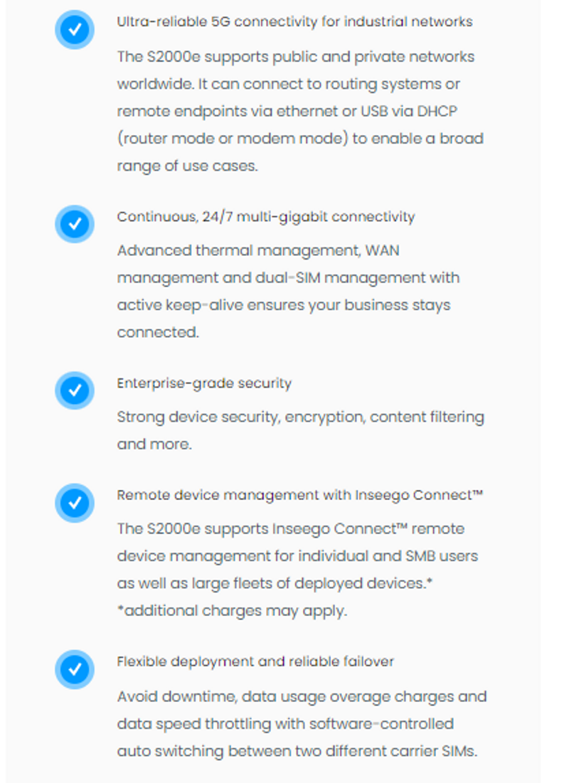 The Inseego Wavemaker™ 5G industrial gateway S2000e brings the best of 5G to a wide range of enterprise environments, from factories and warehouses to ports, fleets, and smart city networks.