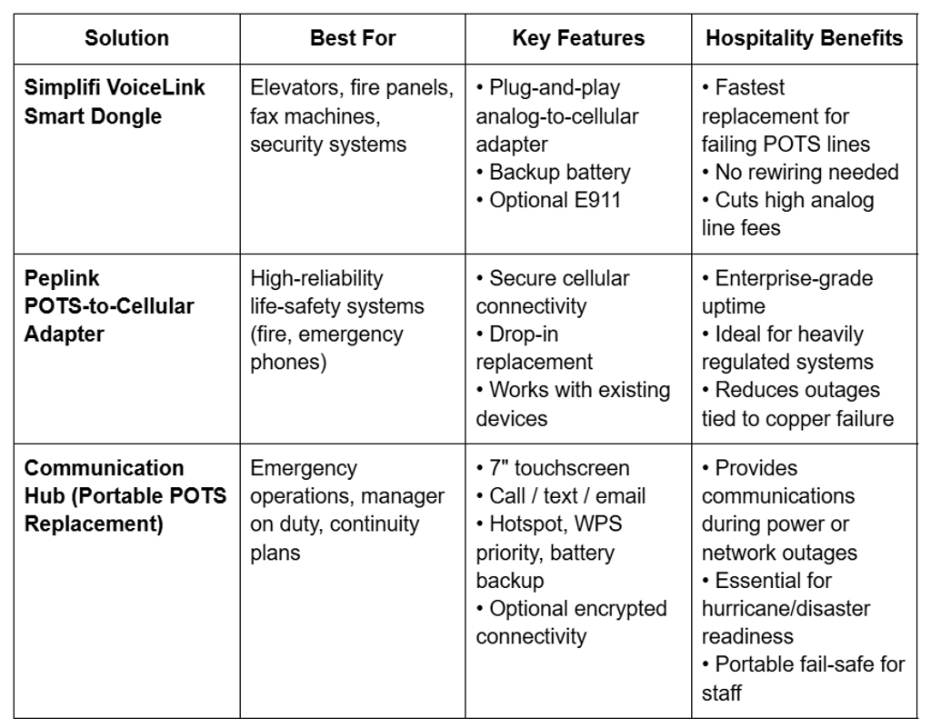 Below is a quick guide to the POTS replacement solutions we deploy most often in hotels.